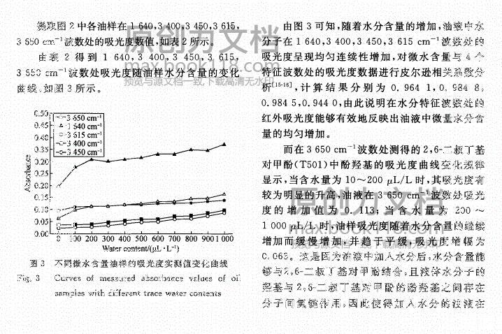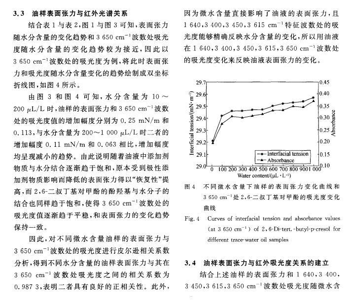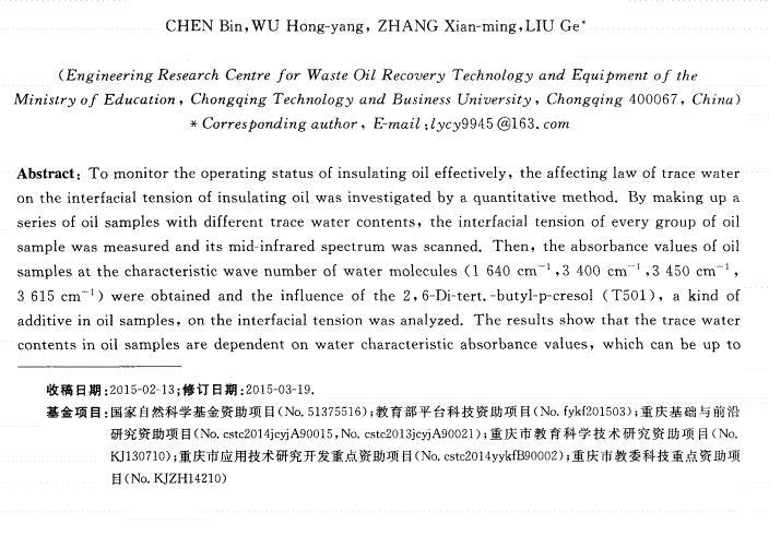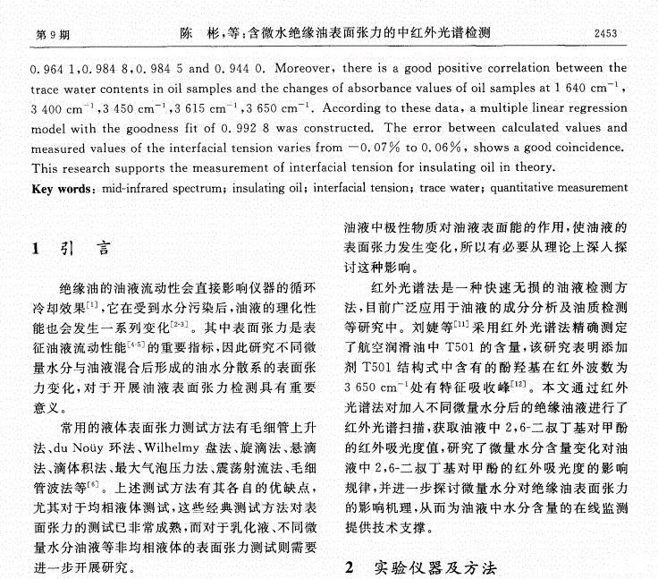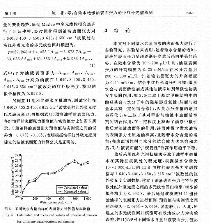 【摘要】:為了有效監(jiān)控絕緣油的運行狀態(tài),采用定量分析方法探討了微量水分對絕緣油表面張力的影響規(guī)律。通過配制不同微水含量的絕緣油樣,對每組油樣進(jìn)行表面張力測試,然后對油樣進(jìn)行紅外光譜掃描,獲取了油樣中水分在特征波數(shù)處(1 640,3 400,3 450,3 615cm-1)的吸光度值。分析了油液中2,6-二叔丁基對甲酚(T501)等添加劑對油樣表面張力變化規(guī)律的影響。結(jié)果表明:油樣中水分含量與水分特征吸光度值之間有較好的相關(guān)性(相關(guān)系數(shù)分別為0.964 1,0.984 8,0.984 5,0.944 0),油樣表面張力和1 640,3 400,3 450,3 615,3 650cm-1波數(shù)處油樣吸光度值的變化亦均呈現(xiàn)良好的正相關(guān)性。建立了油樣表面張力與特征波數(shù)處油樣吸光度值的多元線性回歸模型,擬合精度為0.992 8;根據(jù)模型得到的表面張力計算值與實際測量值誤差為-0.07~0.06%,吻合性較好。文中的實驗可為含微水絕緣油的表面張力檢測提供理論支撐。