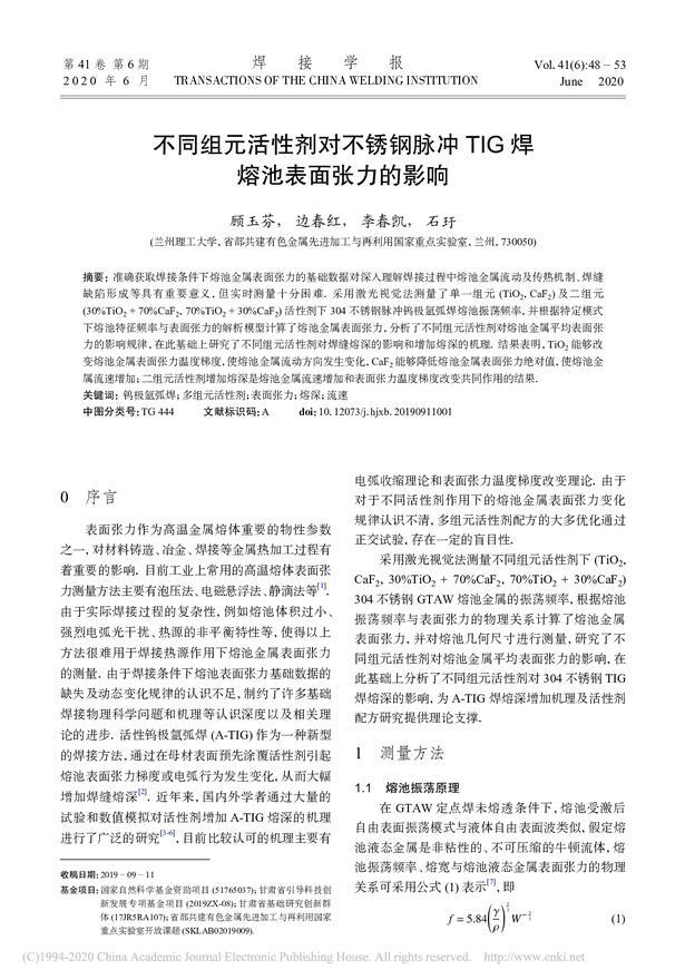 不同組元活性劑對不銹鋼脈沖TIG焊熔池表面張力的影響