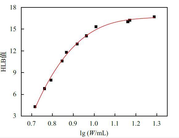 標準曲線的測定:選擇司盤80和吐溫20作為標準物質,改變質量比,得到不同HLB值的試樣。將標準物質測得的水數W(取對數)與相應HLB值作圖,用多項式擬合得到擬合曲線,結果如圖1所示。