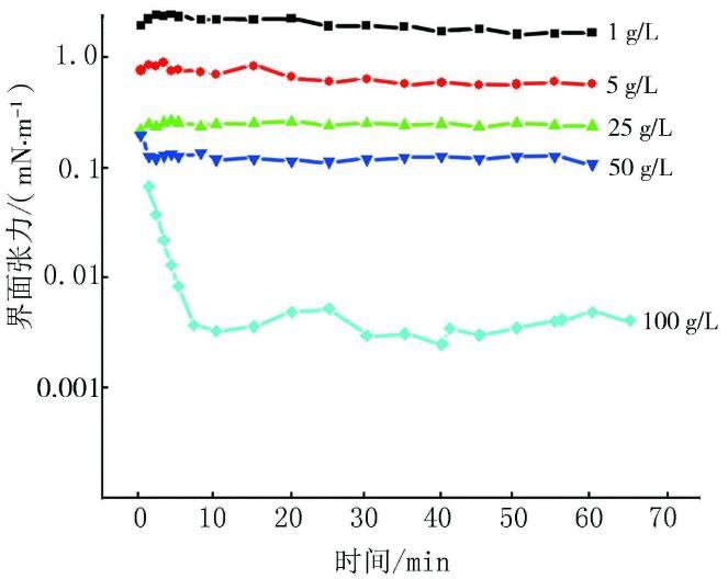 為了選擇合適界面張力體系來進行驅油實驗,實驗室內配置了礦化度分別為1,5,25,50,100 g/L,質量分數為0.2%的9AS-3-0溶液,并對其與原油之間的界面張力進行了測量。實驗結果見圖1。