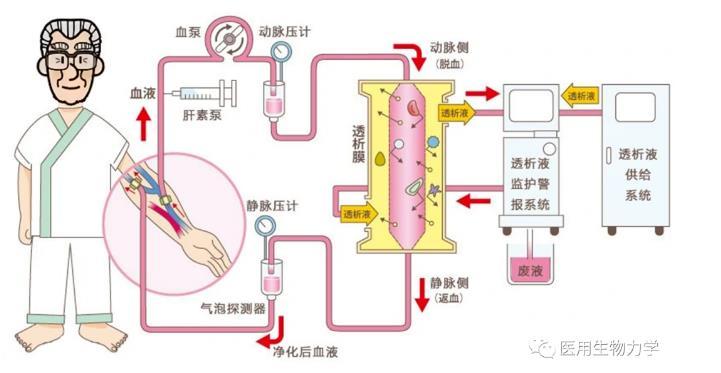 血液透析是急慢性腎功能衰竭患者腎臟替代治療方式之一。通過將體內(nèi)血液引流至體外,經(jīng)一個由無數(shù)根空心纖維組成的透析器中,血液與含機(jī)體濃度相似的電解質(zhì)溶液(透析液)在一根根空心纖維內(nèi)外,隔著半透膜進(jìn)行透析,通過彌散、超濾、吸附和對流原理進(jìn)行物質(zhì)交換,清除體內(nèi)的代謝廢物、維持電解質(zhì)和酸堿平衡;同時清除體內(nèi)過多的水分,并將經(jīng)過凈化的血液回輸?shù)恼麄€過程稱為血液透析。